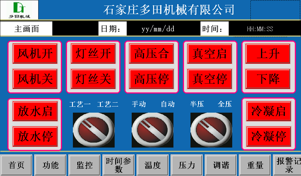 1、采用PLC與觸摸屏程序自動控制,各種加熱參數(shù)設(shè)置簡單明了,木材烘干過程可無人值守完全自動控制。
